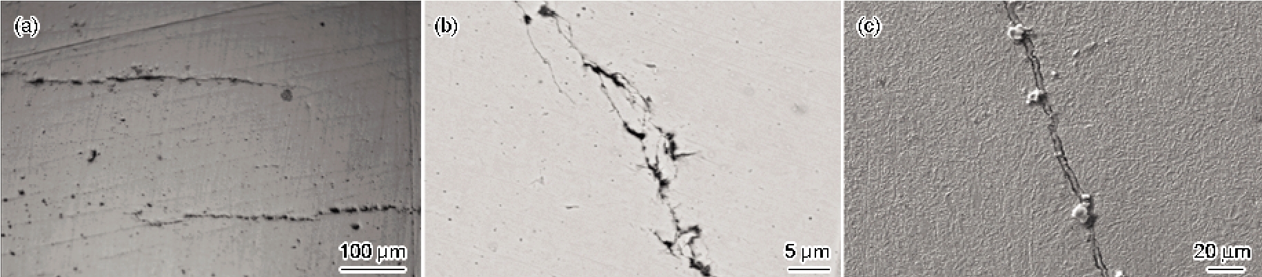 依据GB/T 8650-2006对X100管线钢焊接接头进行抗HIC实验,测得CSR,CLR和CTR的数据见表2。裂纹的OM和SEM像示于图2。