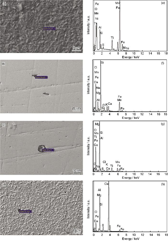 为进一步分析焊缝中非金属夹杂物的类型和成分,对夹杂物进行SEM和EDS分析,结果见图7。