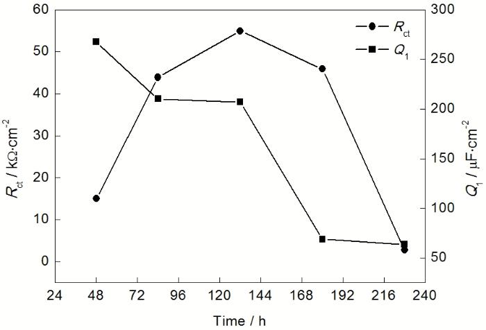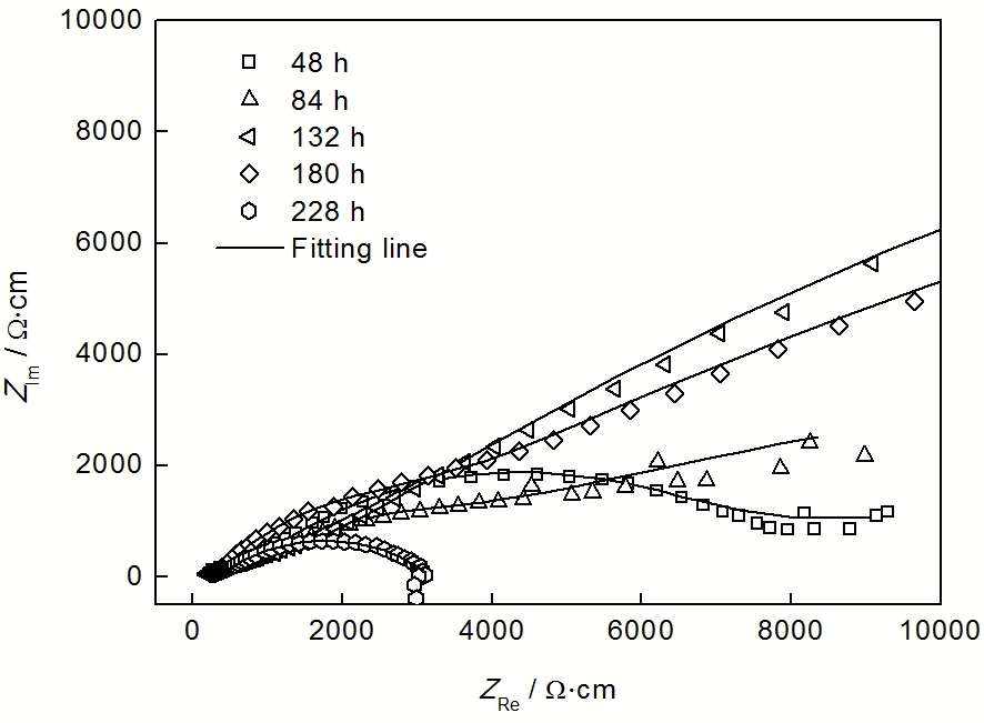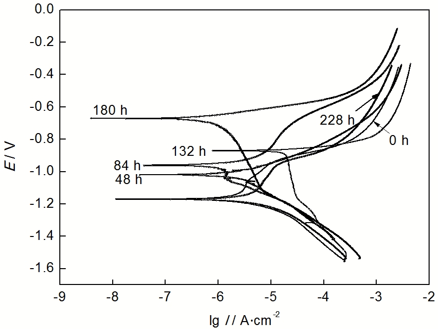 但是从图4中可以看出,镀锌钢腐蚀不同时间后,其腐蚀电位变化比较明显。随着腐蚀时间的延长,腐蚀电位逐渐增大,在180 h时达到最大,而在228 h时腐蚀电位开始减小,仅比未腐蚀试样的腐蚀电位略大。通常情况下,可用腐蚀电位来评价材料的耐蚀性能,腐蚀电位越高,材料的耐蚀性能越好[34 ] 。本文的研究结果表明,随着腐蚀时间的增加,镀锌钢耐蚀性先逐渐增强后减弱。分析原因可能是,锈层的逐步形成对镀锌钢有一定的保护作用,当锈层继续增加时,一方面由于腐蚀产物的形貌发生改变,由针叶状变为结节的球状,球状之间存在着一定的孔隙,腐蚀很可能继续在局部发生,从而使得保护性能下降。另一方面由于腐蚀产物的部分脱落,使得锈层变薄,从而使得保护性能下降。但从整个腐蚀过程来看,带锈的镀锌试样均比未腐蚀的镀锌试样的腐蚀电位高,这说明带锈的镀锌试样耐腐蚀性相对提高,即腐蚀活性相对降低。