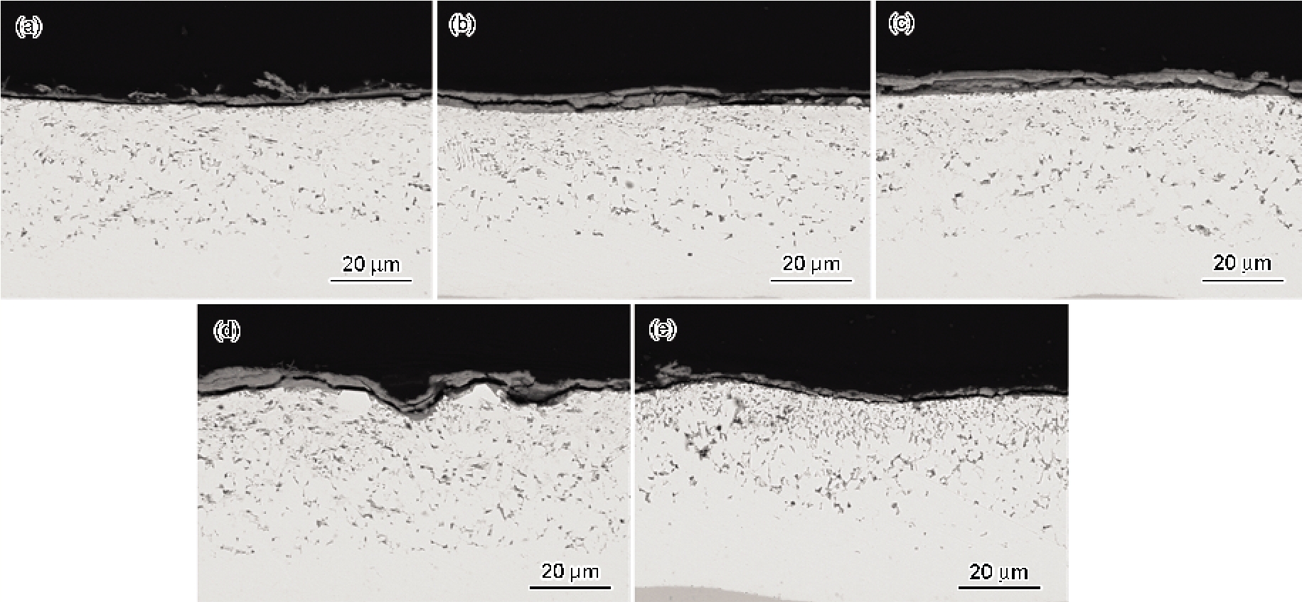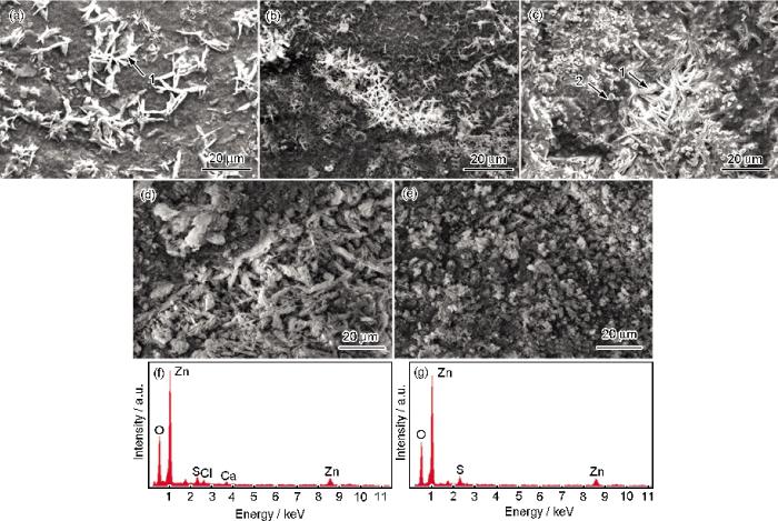 ... 图2为不同周期镀锌钢表面的腐蚀形貌以及腐蚀产物的成分.图2a~e反映腐蚀产物形貌随腐蚀时间的变化情况,图2f和g分别对应图2中产物1和2的成分.腐蚀初期,在镀锌钢表面形成针状和针叶状结构的产物 (图2a和b),随着腐蚀时间的延长,针叶状的产物逐渐增加,并聚集成片,覆盖在镀锌钢表面.腐蚀时间继续增加,开始出现结节状 (图2c) 的产物.结节状的产物不断增加,逐渐将针状产物所取代.由腐蚀产物成分 (图2f和g) 可知,两种腐蚀产物主要包含的元素都为Zn,O,S和Cl.结合文献[32 ,33 ] 可知,腐蚀过程表现为:Zn首先和潮湿空气中的O2 反应生成ZnO和Zn(OH)2 ,模拟酸雨溶液中SO4 2 - 和Cl- 的存在,使其进一步生成复杂的产物,反应过程为: ...