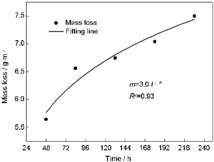 ... 采用CCT型循环盐雾试验机进行腐蚀实验,实验过程中试验箱温度为 (35±2) ℃,喷雾时的相对湿度在80%以上,以4 h为一个周期,喷雾2 h,干燥2 h,腐蚀液采用模拟酸雨溶液,溶液成分为[25 ] - [27 ] :(NH4 )2 SO4 203.9 mg/L,NaF 17.2 mg/L,KNO3 117.8 mg/L,MgSO4 ...