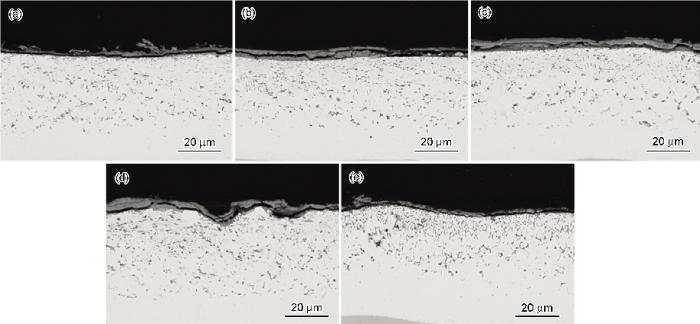 图3所示为镀锌钢腐蚀不同时间的截面形貌。从图中可以看出,腐蚀初期锈层非常薄且不均匀 (图3a),还可以清楚地看到,锈层表面有针片状结构出现,这种结构对镀锌钢表面的保护作用较小,随腐蚀时间的延长锈层逐渐增厚,132 h后较之前更明显。从图3c和d中可明显观察到双锈层的出现,外层较疏松,内层较致密。因而对镀锌钢的保护作用逐渐增强。但在228 h后锈层变薄,这是因为疏松层的腐蚀产物逐渐脱落导致。