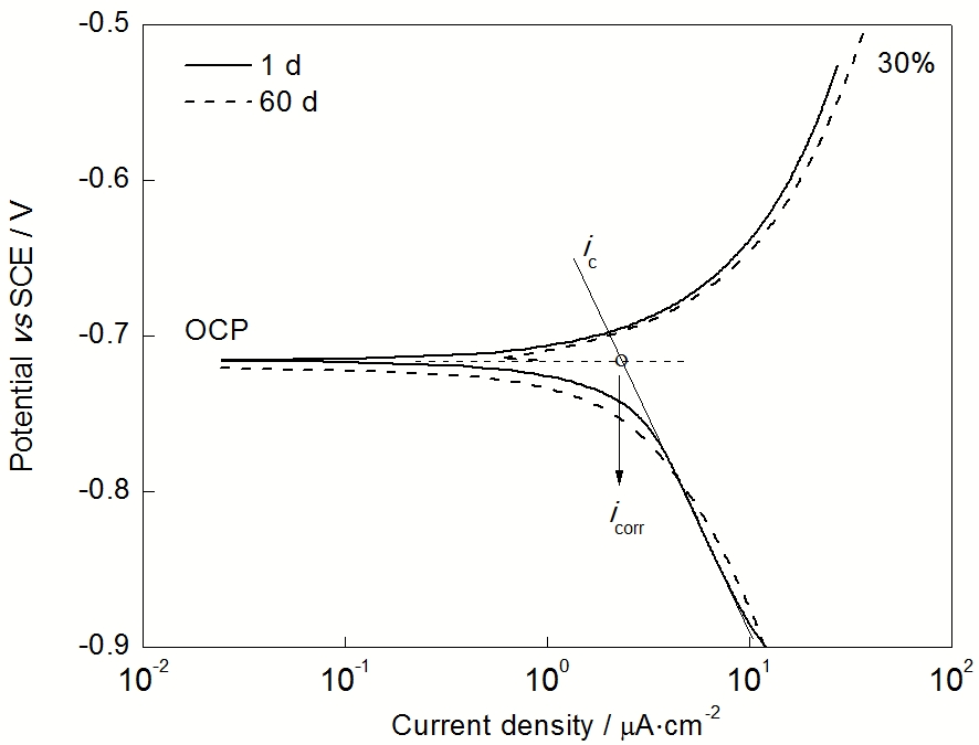 ... 图2为X80管线钢在水饱和红壤泥浆中分别埋样1和60 d后所测得的Tafel曲线.可见,X80钢在红壤泥浆中的OCP为-720 mV,埋样过程中变化不大.暴露过程中Tafel曲线也未见显著变化,埋样60 d后,自然腐蚀电流密度稍微减小;但Tafel区的阳/阴极反应速率均增大,特别是阴极区,Tafel斜率降低.X80钢的自腐蚀电流密度i corr 由阴极Tafel外推法[12 ] 获得:阴极Tafel拟合线外推得阴极电流i c ,i c 在OCP处的值即为i corr ,如图2所示.所得X80钢在红壤中暴露1和60 d后的自腐蚀电流密度i corr 分别为2.3 µA/cm2 (0.027 mm/a) 和2.1 µA/cm2 (0.024 mm/a). ...