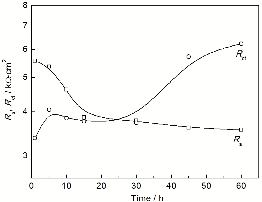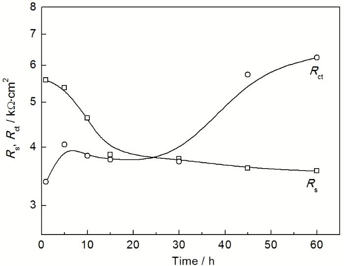 图6 由等效电路 (C s R s ) (Q dl R ct ) 拟合得到的R s 与R ct 随埋样时间的变化