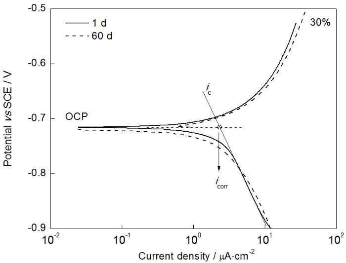 图2 X80管道钢在水饱和红壤中分别暴露1和60 d后的Tafel曲线