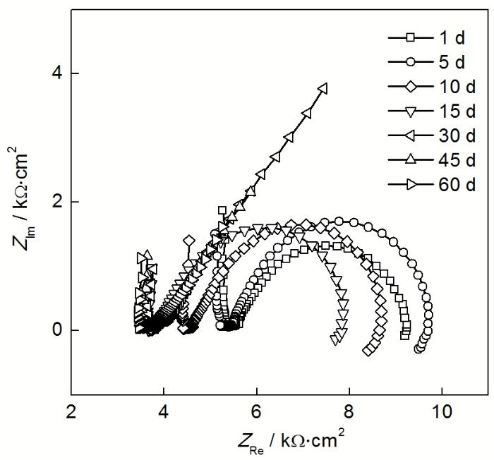 Fig.3 Nyquist plots of X80 pipeline steel after exposure for different time in water-saturated acidic red soil