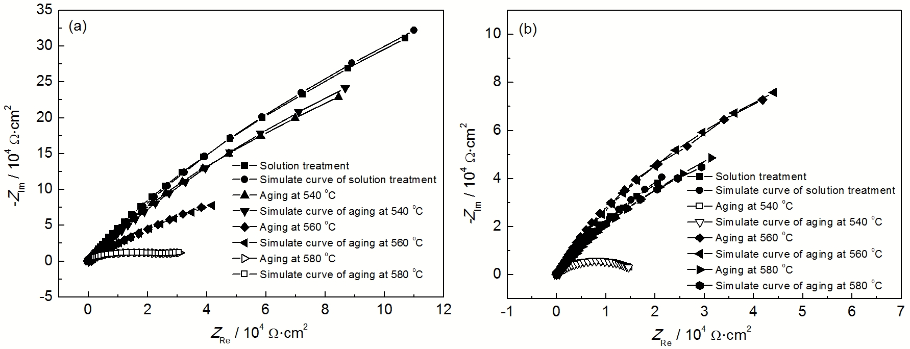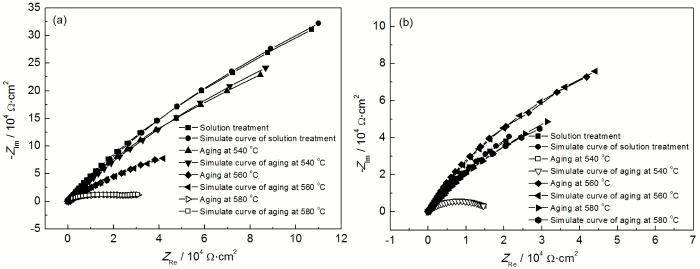 图2为含铜双相不锈钢在无菌/含菌培养基中的阻抗Nyquist图。从Nyquist图的圆弧直径可以初步判断材料在不同培养基中的腐蚀情况。在无菌培养基中,Nyquist图中固溶处理试样的圆弧直径远远大于时效处理试样的圆弧直径。圆弧直径越大,说明阻抗值越大,介质中实际电荷转移量越少,材料钝化膜越稳定。随着时效温度的升高,Nyquist图容抗弧直径均减小,说明试样钝化膜稳定性逐渐下降。在含菌培养基中,经560 ℃时效处理试样的钝化膜最稳定;固溶处理及经580 ℃时效处理试样的钝化膜稳定性较差;经540 ℃时效处理试样的钝化膜稳定性最差。