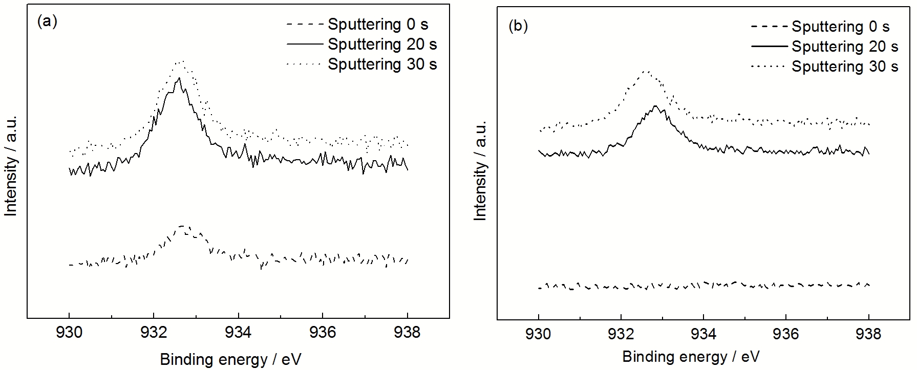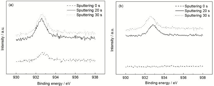 | Sample | Sputtering time / s | 932.6 eV (Cu) | 933.7 eV (CuO) | 934.8 eV (CuCO3) | 935.1 eV (Cu(OH)2) |