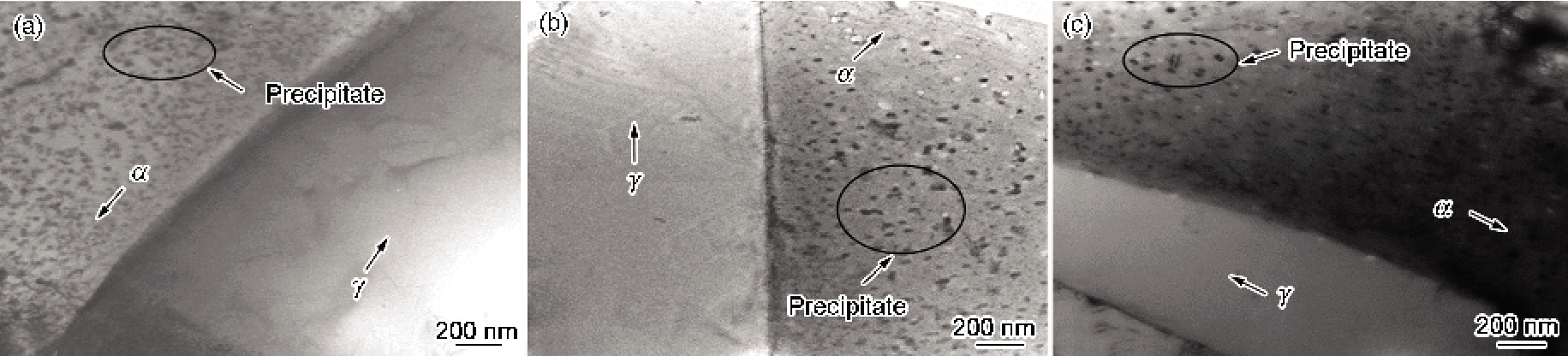 本课题组[6]前期采用Tecnai G2 F20 STWIN的透射电子显微镜 (TEM) 及其附带的能谱仪 (EDS) 对时效处理试样进行组织形貌观察和成分分析。采用图像分析软件 Image-Pro Plus对富铜析出相粒径进行定量分析。TEM薄膜样品的制备采用机械研磨和双喷减薄相结合的方法。从时效处理后的试样上切取厚0.2~0.3 mm的薄片,机械研磨至60~80 μm后制成直径为3 mm的圆片,采用双喷减薄方法制成TEM观察用试样。双喷溶液为5%高氯酸+20%丙三醇+75%乙醇,减薄电压为50 V,温度为-20 ℃。