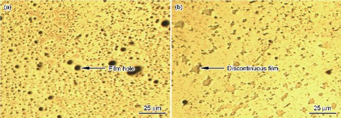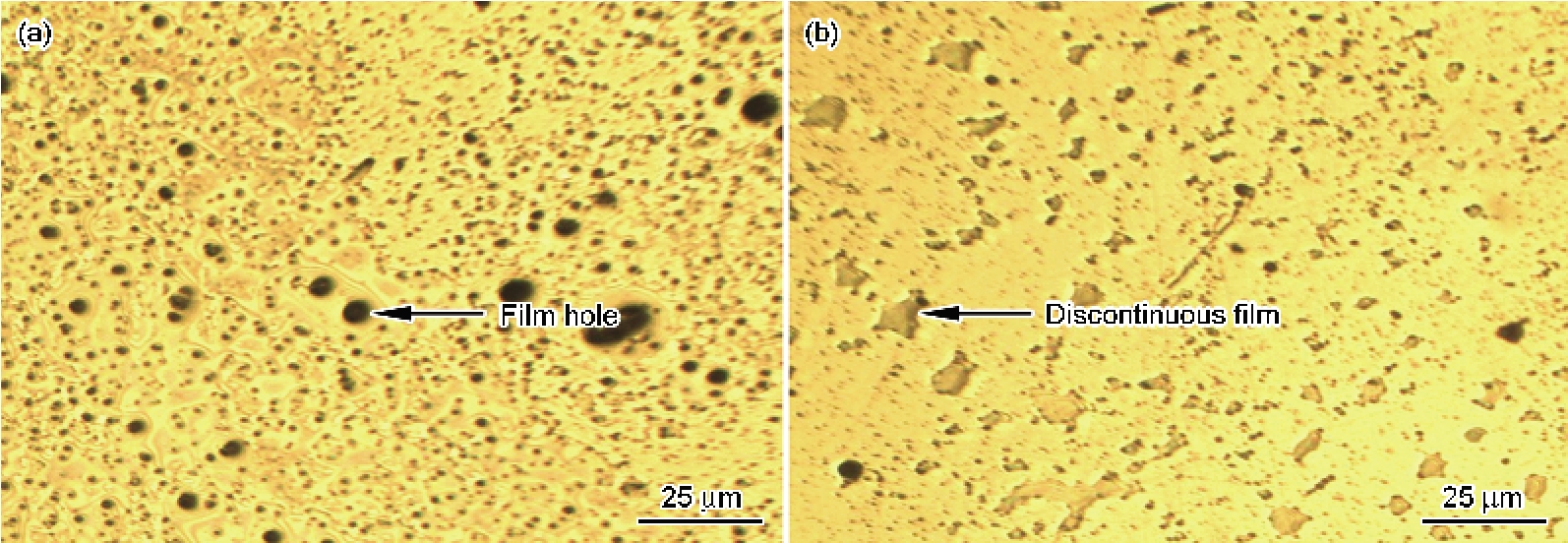 生物膜成分一般较复杂,由细菌、培养基物质、腐蚀产物及胞外聚合物 (EPS) 等共同组成,微生物腐蚀是这些物质共同发挥作用的结果。图5为两种试样表面生物膜的OM像。可以看出,固溶处理试样表面的生物膜较厚且呈疏松多孔状,经560 ℃时效处理试样表面生物膜较稀薄并且不连续。