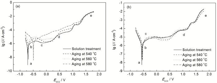 图1为试样在无菌/含菌培养基中的极化曲线。由图可知,这些试样的极化曲线均包含活化区 (ab),活化钝化转变区 (bc),钝化区 (cd) 和过钝化区 (de)。极化曲线计算所得参数见表1。由表1可知,在无菌培养基中,经时效处理试样随着时效温度的升高,腐蚀电流密度逐渐增大,材料耐点蚀能力逐渐下降。而仅经过固溶处理的试样其腐蚀电流密度最小,最耐点蚀。在含菌培养基中,经560 ℃时效处理试样的腐蚀电流密度最小,试样最耐点蚀;经固溶处理及580 ℃时效处理试样的耐点蚀能力略低;经540 ℃时效处理试样的耐点蚀能力最差。
