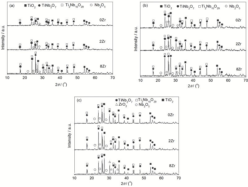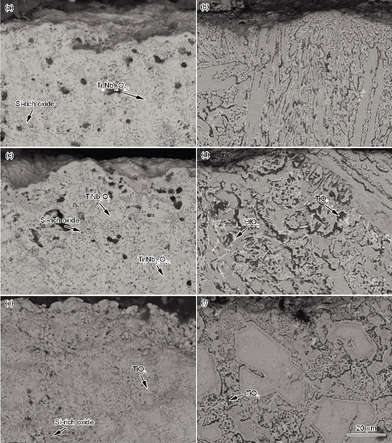 (3) 经过1250 ℃, 50 h氧化后, 4Zr和8Zr合金的氧化膜未发生剥落, 且具有分层结构: 最外层为致密的单相TiO2层, 中间层主要由ZrO2, TiO2和TiNb2O7组成, 内层则主要为Si的氧化物和TiNb2O7, 且氧化膜与基体保持完整结合.