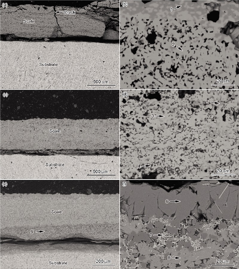 Fig.8 BSE images of cross-sections of scales of 0Zr (a, b), 2Zr (c, d) and 8Zr (e, f) alloys after oxidation at 1250 ℃ for 50 h at low (a, c, e) and high (b, d , f) magnification