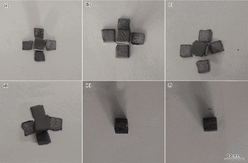 Fig.4 Macro-morphologies of 0Zr (a), 0.5Zr (b), 1Zr (c), 2Zr (d), 4Zr (e) and 8Zr (f) alloys oxidized at 1250 ℃ for 50 h