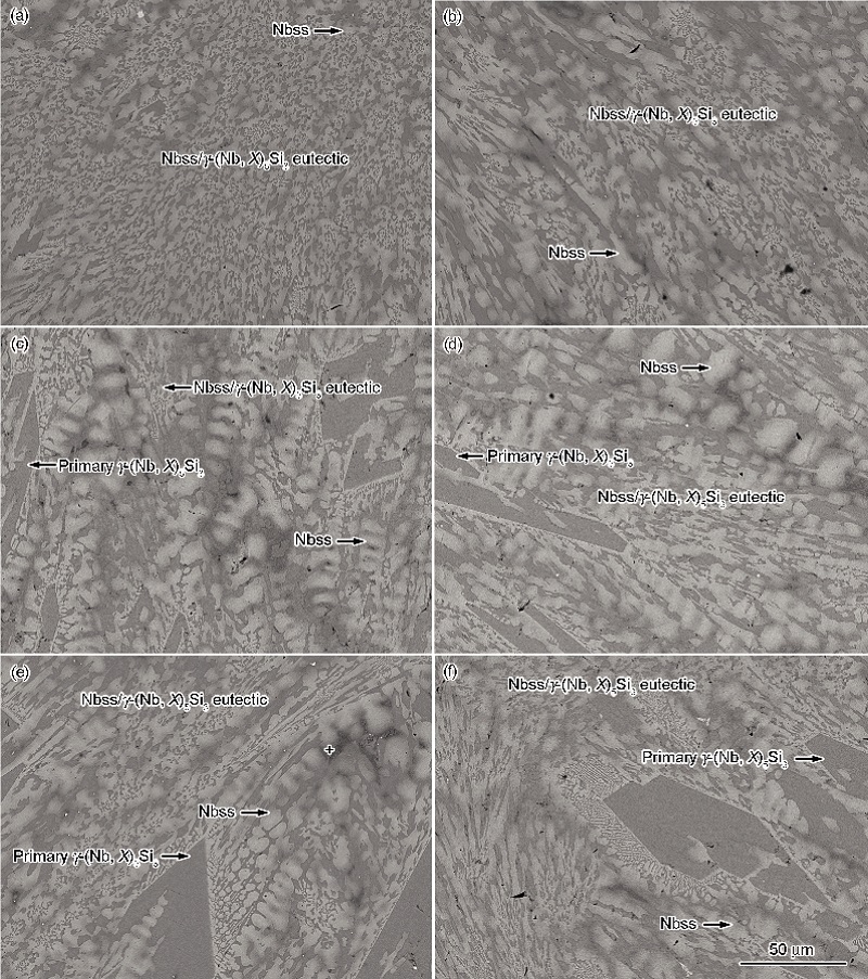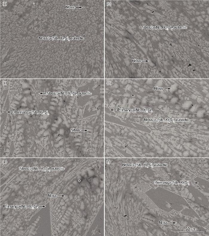 (1) 电弧熔炼态下, Nb-22Ti-15Si-5Cr-3Hf-3Al-xZr (x=0, 0.5, 1, 2, 4, 8) 合金均由g-(Nb, X)5Si3和Nbss相组成. 但随着Zr含量的增加, 合金中初生g-(Nb, X)5Si3的含量增加, 尺寸增大. Zr具有明显的固溶倾向, 主要固溶于硅化物中取代Nb原子的位置.