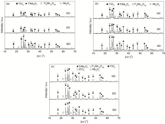 将氧化膜研磨成粉末进行XRD分析, 结果如图5所示. 结合EDS分析可知, 在1250 ℃氧化1, 5, 10和20 h后, 6种Zr含量合金的氧化膜具有相似的相组成, 均主要由TiNb2O7, Ti2Nb10O29, TiO2和Nb2O5组成. 其中, Ti2Nb10O29是一种亚稳的中间相, 随着氧化时间的延长, 该相有向TiNb2O7转变的趋势, 其反应式为[10]: