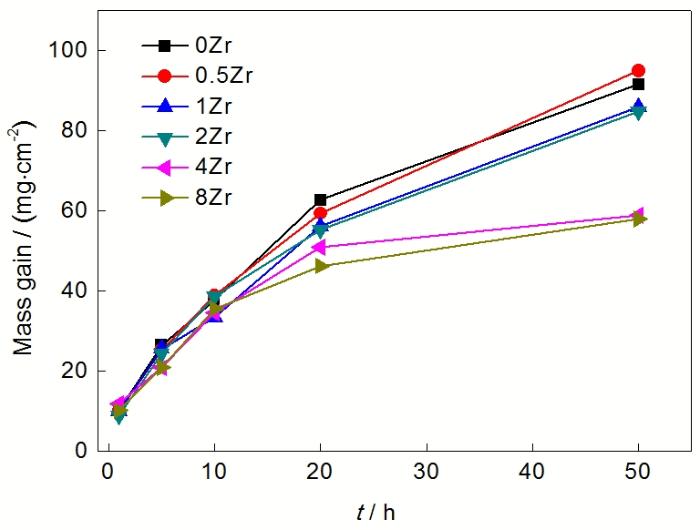 选用高纯Nb块、Si块、Cr块、Al块、一级海绵Ti和高纯Zr颗粒制备质量均为200 g的6种不同Zr含量的合金锭, 其成分为Nb-22Ti-15Si-5Cr-3Hf-3Al-xZr (x=0, 0.5, 1, 2, 4, 8, 原子分数, %). 为了便于描述, 用xZr (x=0, 0.5, 1, 2, 4, 8)来表示这6种合金. 将原材料酸洗或碱洗, 然后用纯水清洗干净、晾干, 按配比称量好, 放入自制真空非自耗电弧熔炼炉的水冷Cu坩埚中进行熔炼. 每个合金锭都经6次反复熔炼, 每次熔炼的最后时刻加电磁搅拌, 以保证成分均匀. 采用电火花线切割法从各个钮扣锭上相同位置处切取8 mm×8 mm×8 mm的立方块试样, 用于电弧熔炼态组织分析及恒温氧化实验. 用SiC水砂纸将试样表面逐级打磨, 然后在无水乙醇中超声波清洗、吹干, 并对试样进行称重和测量表面积. 在自制的高温氧化炉内进行静态氧化, 氧化温度1250 ℃, 氧化时间分别为1, 5, 10, 20和50 h, 在试样随炉冷却后分别测得其氧化增重.