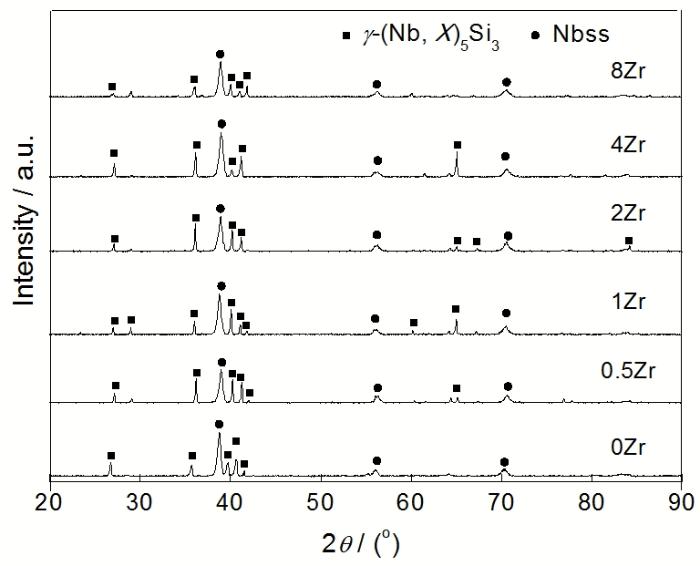 Fig.1 XRD spectra of the as-cast Nb-22Ti-15Si-5Cr-3Hf-3Al-xZr alloys (0Zr, 0.5Zr, 1Zr, 2Zr, 4Zr and 8Zr represent x=0, x=0.5, x=1, x=2, x=4 and x=8 alloys, respectively. Nbss is Nb solid solution)