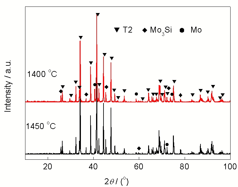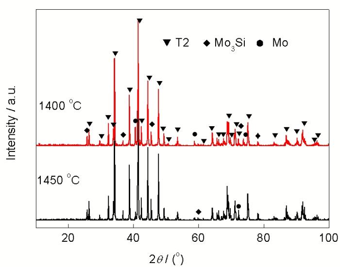 综合考虑T2相转化率、残余单质Mo和Mo3Si含量, 1400~1450 ℃是相对较好的烧结温度区. 本工作通过延长烧结时间来消除残留单质Mo, 以求获得纯度较高的T2相合金. 图2是烧结时间延长至2 h后的试样XRD谱. 由图可知, 1400和1450 ℃保温2 h后, Mo峰强度明显减弱而Mo3Si峰强度变化不明显. 因此, 延长保温时间也很难得到纯度高的T2相合金.