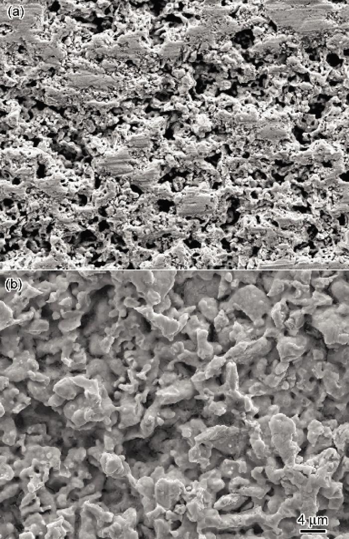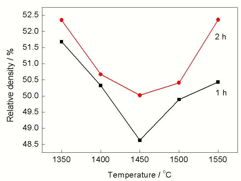 图3为利用Archimedes原理排水法(试样表面涂层凡士林)测得经TFS法不同烧结温度烧结后的试样相对密度. 可见试样相对密度不随温度升高而发生明显的变化, 甚至与生坯相对密度差异不大, 维持在50%左右, 成为典型的多孔材料(图4).