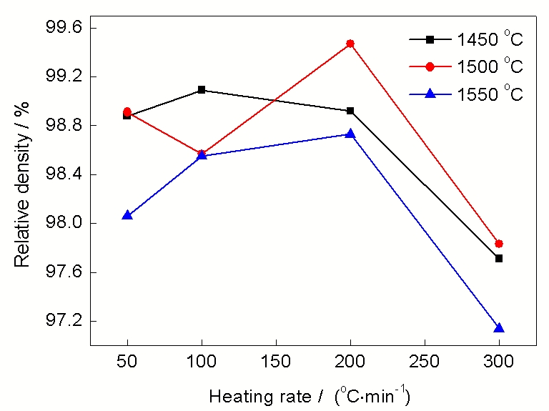 Fig.6 Relative densities of the samples prepared by SPS with different heating rates and sintering temperatures