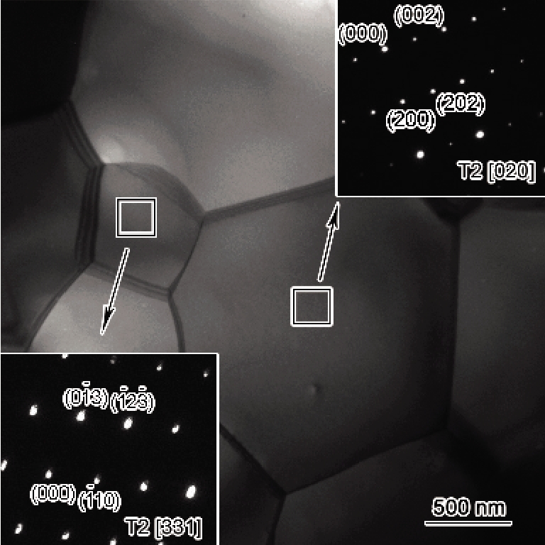 图9a是经SPS法以200 ℃/min速率升温到1500 ℃烧结制备出T2相合金的SEM像和经草酸侵蚀后的T2相合金晶粒OM像. 利用Image-pro plus 6.0 软件, 分别从SEM像和OM像计算出各相的体积分数为99.15%T2, 0.25%MoB, 0.60%SiO2, T2相合金平均粒径为1.44 μm (图9b). 图10给出SPS法 (200 ℃/min, 1500 ℃) 制备出试样的TEM明场像及相应的SAED谱. 可以看出, 晶界处十分清晰, 洁净无过渡区, 无其它物质存在, 且在晶体内没有发现位错等缺陷. 经SAED标定出这些晶粒为单一T2相, 这进一步证实了SPS法明显优于氩电弧熔炼法、机械合金化法和TFS法, 而制备出了纯度高、致密且晶粒细小的T2相合金.