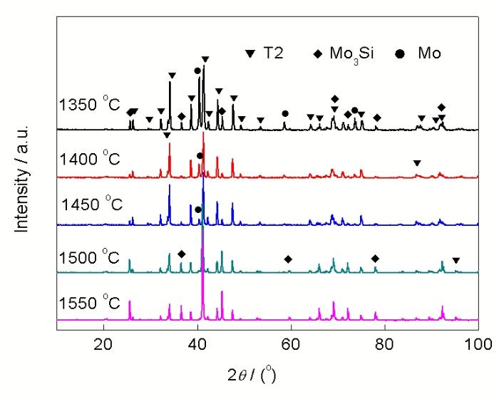图1为Mo-Si-B压缩圆片经TFS法在不同温度下烧结1 h后的XRD谱. 由图可知, 1350 ℃烧结试样的谱线中含有较强的Mo衍射峰和Mo3Si衍射峰, 即试样中含有较多的残余单质Mo和Mo3Si, 表明此时试样反应不充分. 随温度升高, Mo峰强度减弱, 至1500 ℃时完全消失, 然而Mo3Si峰强度非但没有减弱反而有增强趋势. 1550 ℃时, 试样中Mo3Si含量高于1500 ℃, 且明显高于1350 ℃. 这说明升高烧结温度更倾向于使Mo完全反应生成Mo3Si而不是T2相. 这可能与试样局部熔化有关, 当烧结温度超过Si的熔点 (1412 ℃)时, 试样就会发生局部熔化, 加剧了Si的挥发. 从饱和蒸气压方面来说, Si的饱和蒸气压 (约10-1 Pa, 1500 ℃) 明显高于Mo (约10-7 Pa, 1500 ℃) 和B (约10-5 Pa, 1500 ℃)[17], 使得Si挥发量明显高于Mo和B. 因此, 升高温度加剧改变试样原成分配比, 从而反应生成Mo3Si等二元相.