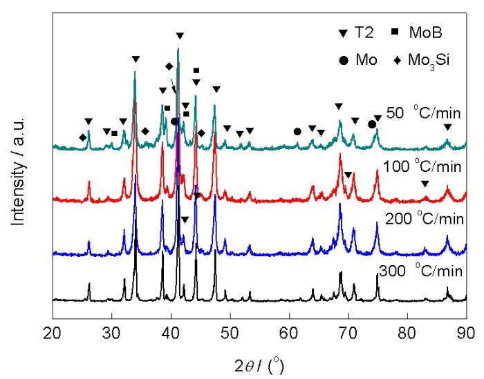 图5为试样经SPS法在50~300 ℃/min升温速率下1500 ℃烧结后的XRD谱. 由图可知, 各升温速率条件下试样中的主相均为T2, 而第二相的含量差异较大. 升温速率为50 ℃/min时, 试样XRD谱中Mo, MoB和Mo3Si衍射峰明显, 说明试样中不但MoB和Mo3Si含量较高, 而且存在残余未反应的单质Mo; 升温速率为 100 ℃/min时, XRD谱中Mo峰消失而Mo3Si和MoB峰强度明显减弱; 当升温速率增加到200 ℃/min及以上时, Mo3Si等衍射峰完全消失.
