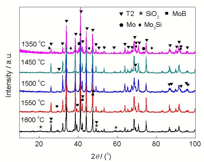 图1 Mo-12.5Si-25B粉末经常压烧结(TFS)法不同温度烧结1 h的XRD谱