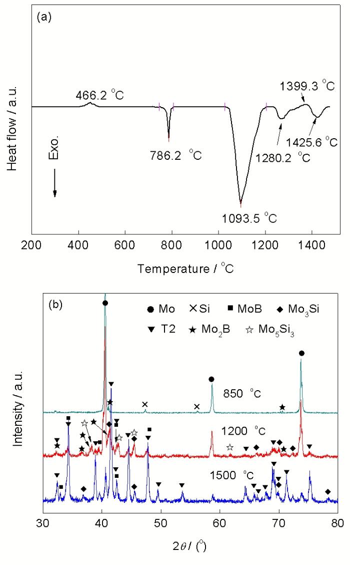 Fig.11 DSC curve of Mo-12.5Si-25B mixed powder heated up to 1500 ℃ with 10 ℃/min (a) and XRD spectra of products after heating to different temperatures with 10 ℃/min (b)