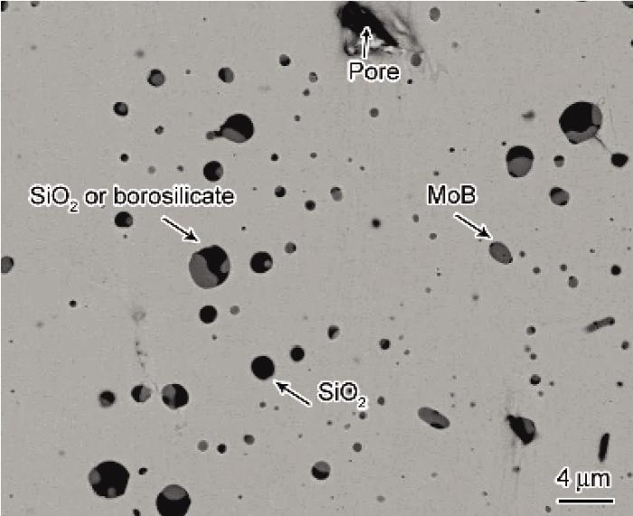 由于液态Si的扩散速度快, 反应(6)和(7)得以进行, Mo2B, Mo, Si和B相互反应生成T2, 而部分Mo3Si和 MoB被保留了下来. Mo3Si和 MoB等之间的反应为固-固反应, 反应过程中受到原子扩散的控制. 由于Mo3Si和 MoB晶体结构中空位相对较少, 扩散慢[23,24], 在短时间内很难通过扩散反应完全转化为T2 [24]. 另外, Mo5Si3 (T1)固溶度较大, 作为小原子B在T1中扩散较快, 当B在T1中的固溶量超过它在T1的固溶度时就可以转变为T2[25-27]. 与1200 ℃烧结时相比, 试样中残留的Mo, MoB和Mo3Si没有明显减少, 说明提高烧结温度使MoB和Mo3Si转变为T2基本上是不现实的, 要得到T2单相合金就要避免MoB和Mo3Si等二元相的形成.