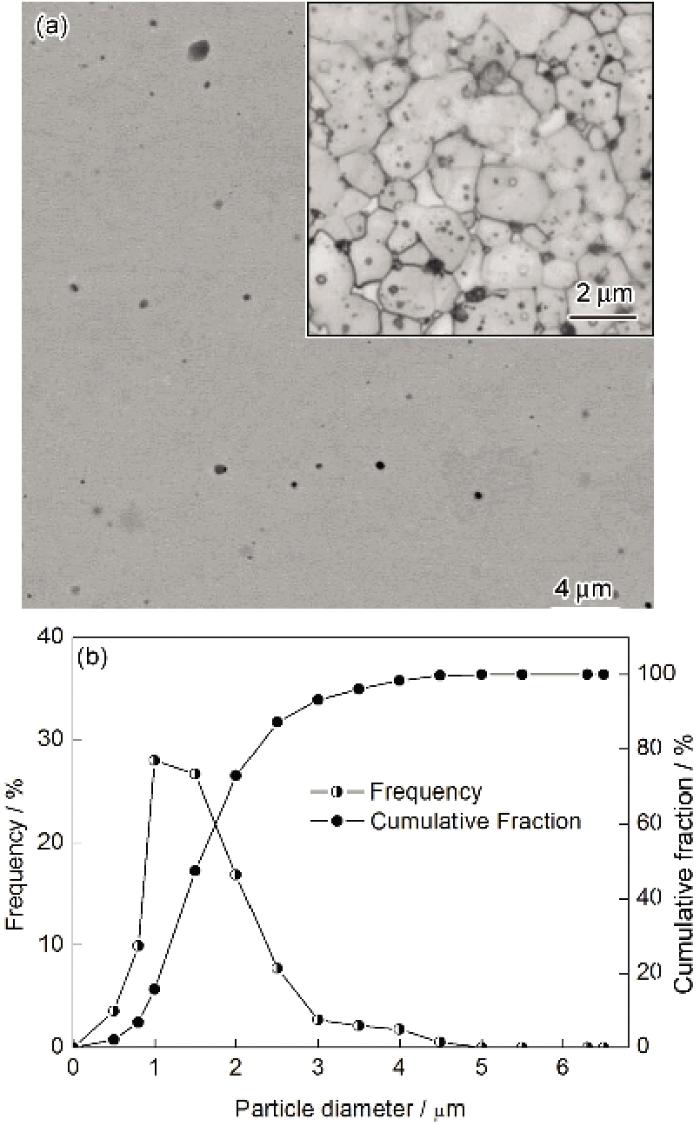 Fig.9 SEM image of the sample prepared by SPS at 1500 ℃ with heating rate of 200 ℃/min and OM image of the sample etched by oxalic acid (inset) (a), and corresponding gain size distribution curves (b)