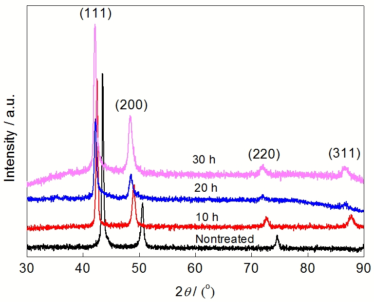 Fig.2 XRD spectra of 316L austenitic stainless steel without carburizing and after carburization at 470 ℃ for 10, 20 and 30 h