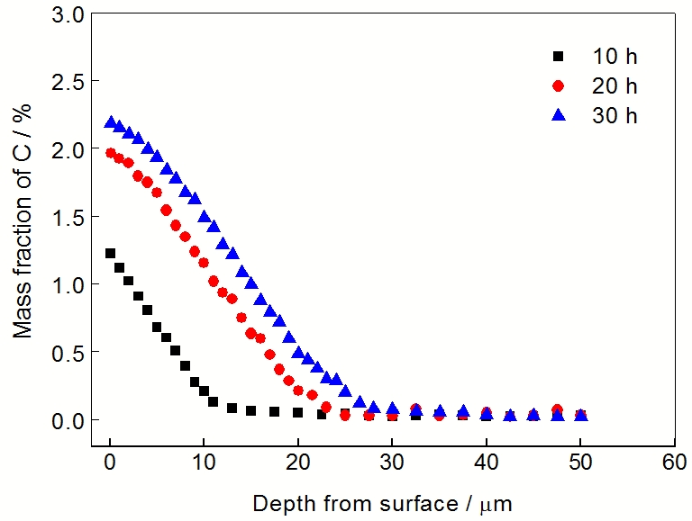 Fig.3 Experimental carbon concentration distribution along depth direction of 316L austenitic stainless steel after carburization