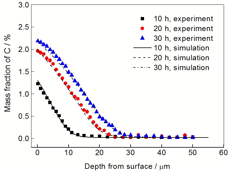 (4) 所建模型仅适于用不发生碳化物析出的低温渗碳. 另一方面, 由于C在奥氏体中扩散时, C进入奥氏体晶格中将产生应力, 不过本模型尚未计及扩散应力的影响.