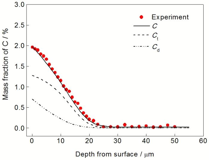 Fig.5 Experimental and calculated carbon concentrations in 316L austenitic stainless steel after carburization at 470 ℃ for 20 h (C—total carbon concentration, Ct—carbon concentration at trapping site, Cd—carbon concentration at diffusion site)