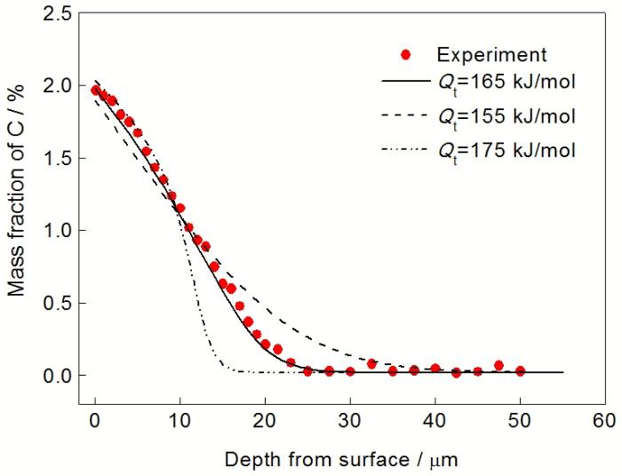 316L奥氏体不锈钢经渗碳20 h后, Qt对C浓度分布的影响如图6所示. Qt主要取决于奥氏体不锈钢的性能, 如成分、机械应力、晶格参数等. 如图6所示, 当去陷阱激活能减小时, 陷阱作用减小, 渗碳层的厚度增加, 扩散过程得到加强, 此时C浓度沿渗层深度方向的分布为凹状, 呈现出典型的扩散分布的形状(根据简单Fick定律). 而当去陷阱激活能增大时, 陷阱作用增强, 渗碳层厚度减小, C浓度沿渗层深度方向的分布出现明显的凸台. 由此可知, 由于Cr原子的存在, 在整个渗碳过程中C的实际扩散系数将小于3.6×10-15 m2/s, 这与Agarwala等[19]及Farkas和Delgado[20]得出的Cr元素的存在会降低C在奥氏体中的扩散系数的结果一致. 当去陷阱激活能取165 kJ/mol 时, 计算得到的C浓度分布与实验得到的C浓度沿渗层深度方向的分布吻合最好. 此时, C在316L奥氏体中的去陷阱激活能比扩散激活能大25 kJ/mol, 即0.26 eV.