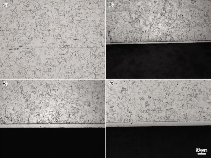 渗碳结束后试样随炉冷却至室温后取出, 并用丙酮进行超声波清洗. 采用AXIO Imager.Alm光学显微镜(OM)观察渗碳后试样显微形貌. 采用ARL X'TRA型X射线衍射仪(XRD)对表面碳化物析出情况进行分析, 靶材为Cu靶, 扫描范围为30°~90°, 扫描速率10°/min. 采用EPMA-1610型电子探针X射线微区分析仪(EPMA)测量渗后试样表层C沿深度方向的浓度分布, 对试样横截面进行线扫描, 采用波谱仪(WDS)进行X射线检测.