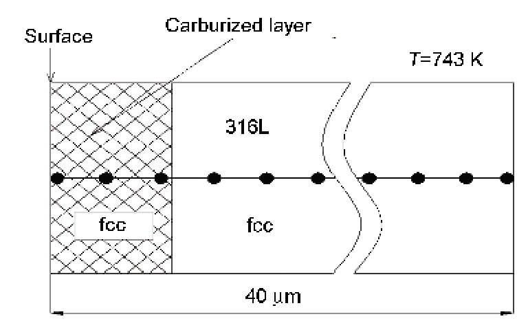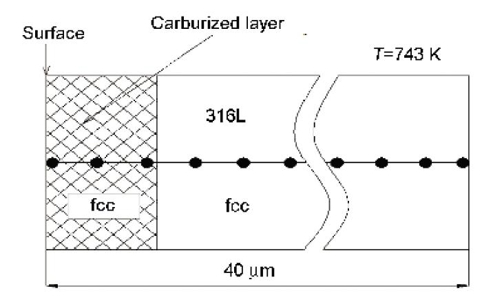 从图2中可以看出, 低温超饱和渗碳层比较均匀, C浓度仅沿着深度方向呈现梯度分布, 故LTCC问题可简化为一维模型, 图6为LTCC模型几何示意图. 模型长度设为40 mm, 沿深度方向按几何分布规律设置阵点, 阵点数量为130, 距离比为0.9. 由图4可知, 超饱和渗碳层中无相变发生, 故渗碳层和316L不锈钢基体均设为fcc结构.