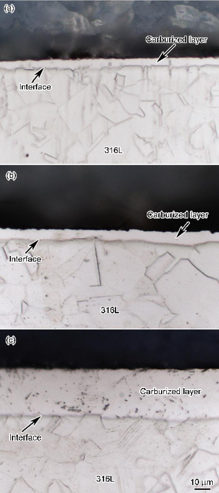 (1) 316L奥氏体不锈钢经过CO/H2/N2混合气体低温超饱和渗C处理后, 无碳化物析出, 表面形成超饱和渗碳层, 其相结构为扩张奥氏体相(S相).