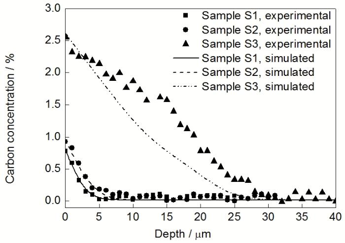 图9   S1, S2和S3试样表面C浓度测量值和模拟曲线