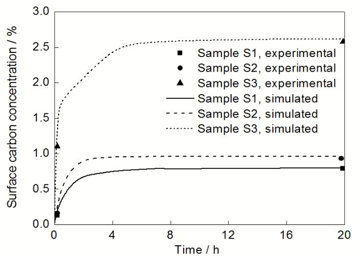 Fig.9   Simulation curves and measured values of surface carbon concentration of samples S1, S2 and S3