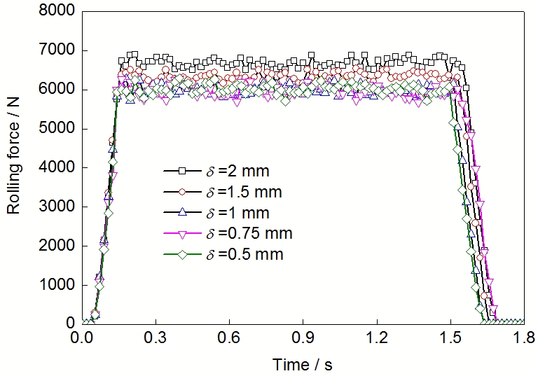 Fig.3 Changes of rolling force with time under different mesh sizes d