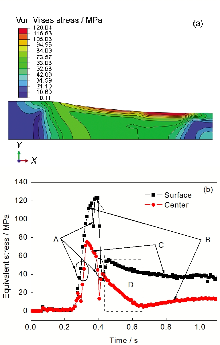 Fig.12 Equivalent stress field distribution (a) and changes of surface and center equivalent stresses with time (A—strain rate of being dominant, B—temperature drop of being dominant, C—temperature rise of being dominant, D—interaction effect) (b)