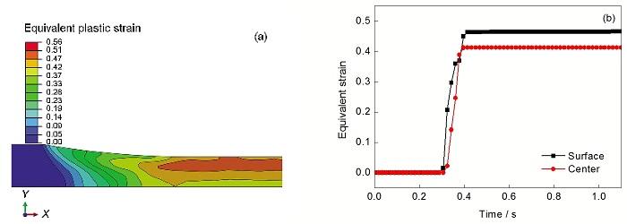 Fig.9 Strain field distribution (a) and changes of surface and center equivalent strains with time (b)