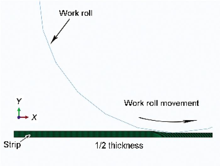 热轧数值模拟属于非线性热-力耦合问题, 分析耗时且容易触发数值奇异问题, 对于三维分析尤其严重. 由于轧制过程中展宽方向的变形量非常小, 因此可以将轧制过程简化为二维平面应变问题[12][19]. 本工作基于Abaqus/Explicit弹塑性热-力耦合分析法, 建立二维有限元模型. 轧板尺寸为500 mm×25 mm, 轧辊直径为520 mm. 因为模型自身具有对称性, 轧板采用1/2模型, 如图1所示. 为了减少初始瞬时冲击扰动, 使轧板的初始速度与轧辊初始接触点速度的水平方向分量相等. 模型采用缩减积分、沙漏控制的双线性四节点温度平面应变耦合四边形单元(CPE4RT).