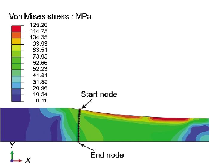 图10所示为轧制稳态阶段某一时刻的速度分布. 可见轧制过程中的轧板可分成3个区域, 即前滑移区、黏着区和后滑移区. 黏着区的速度与轧辊的速度相近, 约为500 mm/s, 此时, 在轧辊和轧板间没有相对速度产生. 轧板表面黏着区的宽度远远大于轧板中心处的宽度, 这进一步证明了图9b中应变曲线拐点的出现.