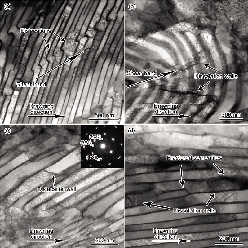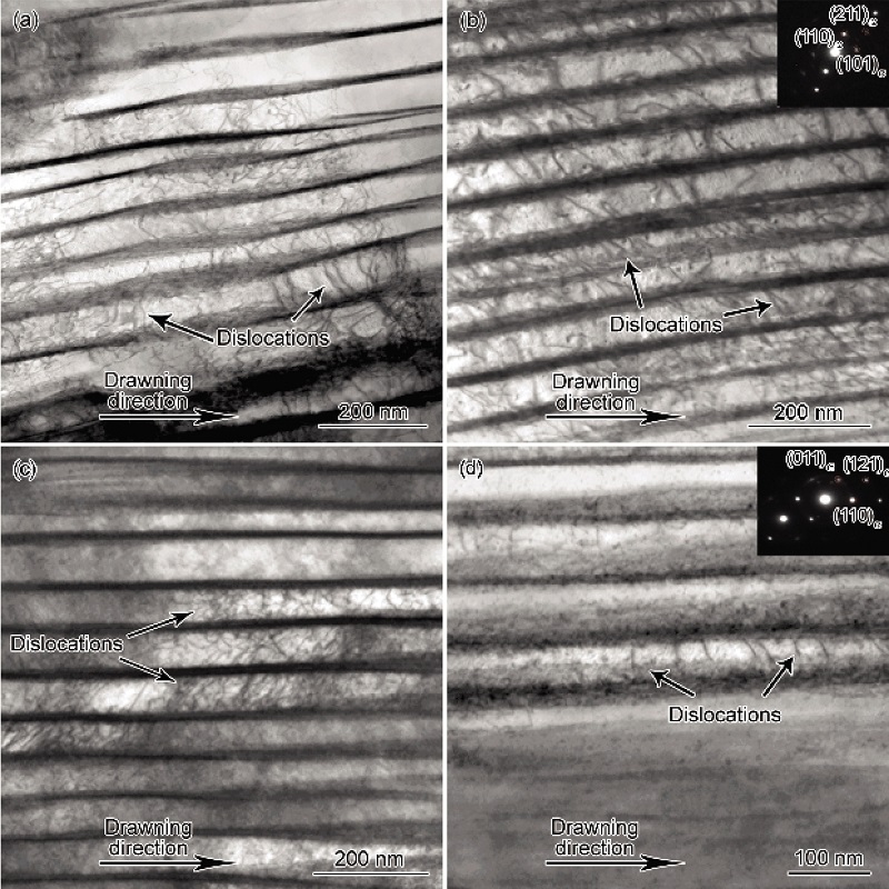Fig.3 STEM images of pearlitic steel wire with bent lamella at strains of 0.25 (a), 0.5 (b), 1.1 (c) and 1.7 (d) (Inset in Fig.3c shows the corresponding SAED pattern)