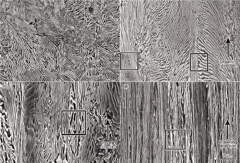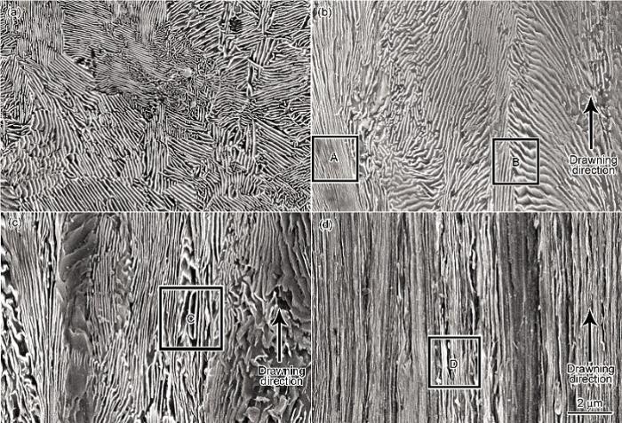 Fig.1 SEM images of cross-sections in pearlitic steel wire with strains of 0 (a), 0.7 (b), 1.7 (c) and 2.5 (d)