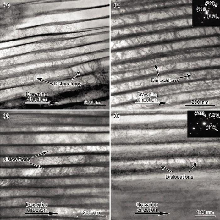 珠光体钢丝在冷拉拔过程中受轴向拉应力、径向压应力的作用, 因层片状铁素体/渗碳体组成的珠光体在层片轴向与径向上形变能力不同, 层片取向将对形变过程起到非常重要的影响, 研究人员[1,15,24]认为根据珠光体层片与拉拔轴向夹角大小可分为2种情况: (1) 层片与拉拔轴向夹角小于30°时, 少量的局部形变使珠光体层片快速旋转至平行于拉拔轴向. 同时, 在较小应变量时(图2b), 铁素体的稳定取向<110>已平行于拉拔轴向, 这可能是因为层片取向接近拉拔轴向时, 铁素体的晶体学取向已经成为影响组织形变的关键因素, 珠光体团不仅通过调整层片取向来减小形变阻力, 同时也使珠光体中铁素体的<110>取向接近拉拔轴向, 减少形变过程需要开动的滑移系, 进一步减小形变阻力. 这也解释了相较于其它组织, 珠光体在冷拉拔过程中, 铁素体<110>丝织构快速形成的原因[21-23]: 珠光体在冷拉拔形变过程中, 不仅通过铁素体的位错滑移形成<110>丝织构, 同时珠光体团的旋转使铁素体的<110>取向迅速接近拉拔轴向, 使得珠光体钢丝在应变量小于1.5时, <110>织构强度迅速上升, 之后缓慢趋于饱和. 层片取向、铁素体<110>取向均平行于拉拔轴向的情况下, 珠光体形变阻力最小, 铁素体仅需开动最少的滑移系即可完成减薄形变, 从而迅速均匀地强化整个组织. 值得关注的是, 在大应变量下, 珠光体层片尺寸已经减薄至50 nm以下, 此时铁素体中位错呈相互平行排列的状态(图2d), 位错密度较应变量为1.1时有所下降, 而在应变量为2.5的试样中, 如图5所示, 这种具有平行排列特征的位错形态更为明显, 研究人员[25]认为, 这时铁素体的强化机制可能发生了改变. (2) 层片取向与轴向夹角大于30°时, 珠光体团难以通过小角度旋转适应形变的需要, 在压应力的作用下, 硬而脆的渗碳体只能通过弯折断裂的方式迅速减小与拉拔轴向的夹角[16], 以减小形变阻力. 这种弯折断裂的组织形成了弯折带, 弯折带上渗碳体逐渐断裂碎化, 铁素体形成高密度的位错胞结构, 这些组织特点使珠光体失去层片组织的力学特性, 致使此类组织层片形变缓慢、层片取向调整困难, 导致在较大应变量下层片仍与拉拔轴向呈一定夹角(图1c). 层片取向与拉拔轴向不平行时, 珠光体组织形变过程中应力状态较为复杂, 铁素体所受应力与轴向拉应力、径向压应力的理想状态差别较大, 虽然没有任何证据显示铁素体在此过程中会开动{110}<111>之外的滑移系, 但复杂的应力状况使铁素体在弯折组织中难以调整至<110>取向(图3c). 在此状况下, 铁素体需要开动较多的滑移系来适应形变, 不可避免地出现位错缠结、位错墙结构, 阻碍了进一步形变强化. 不仅如此, 弯折带上的珠光体渗碳体断裂、碎化, 铁素体存在高密度的位错, 产生应力集中, 使得此类组织发生渗碳体断裂、碎化而产生空位等缺陷, 且影响了组织的热稳定性, 研究[13]表明, 弯折带上渗碳体在热处理过程中率先球化, 降低了钢丝的力学强度与扭转性能.